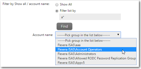 Click Find to filter the list of accounts and groups. For example, to search for all of the users that start with the letter P, use the asterisk wildcard character (*) and enter P* in the Filter list by box.