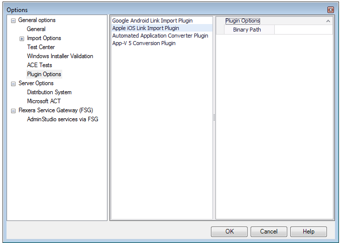On the Plugin Options tab of the Application Manager Options dialog box, you can specify the location in your network of mobile apps that you have already downloaded from a public store: