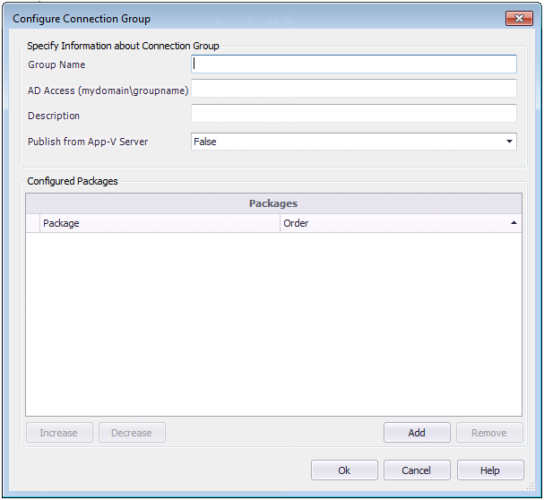 Increase DescreaseThe order of packages in the connection group is important. This determines the order in which the package contents are merged. So, if there was a conflict (example: same registry value), the content of the first package would be used. Use the Increase and Decrease buttons to change the order of the selected package.