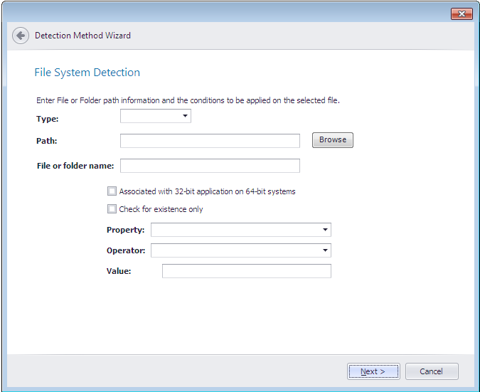 On the File System Detection panel, which opens if you selected File System on the Welcome panel, you enter the file or folder path information and the conditions to be applied on the selected file.