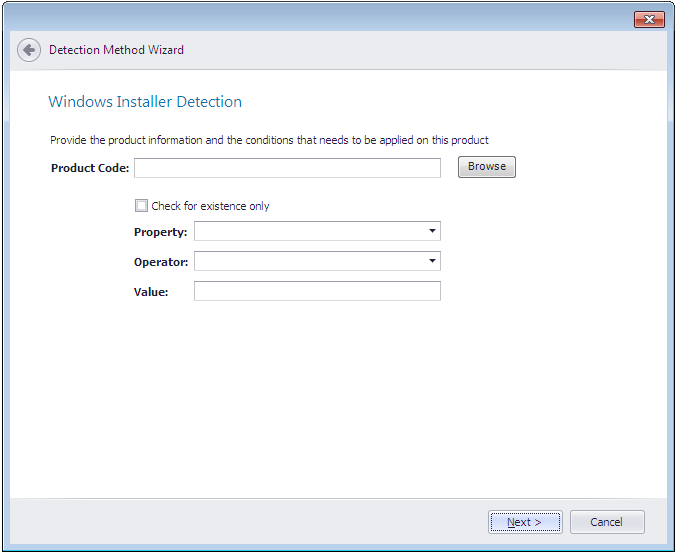 | Product Code | Click Browse and select the Windows Installer .msi file that you want to use in this detection method. The Windows Installer file’s Product Code will then be listed this field. You also have the option of entering the product code. |