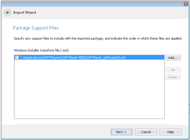 | Windows Installer (.msi) | Transform files (.mst) | All of the .mst files that are in the same directory as the Windows Installer file you are importing are automatically listed, but only those .mst files that AdminStudio determines are probably applicable to this Windows Installer package are selected to be included in the import. If you do not want to import a selected .mst file, clear the selection. You can add additional transform files and specify the order that they will be applied, as described in Adding Additional Package Support Files and Ordering List. |