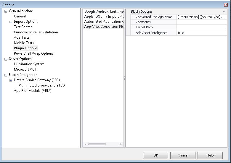 3. In the middle pane, select App-V 5 Conversion Plugin. The App-V 5.0 conversion options are displayed in the right pane.