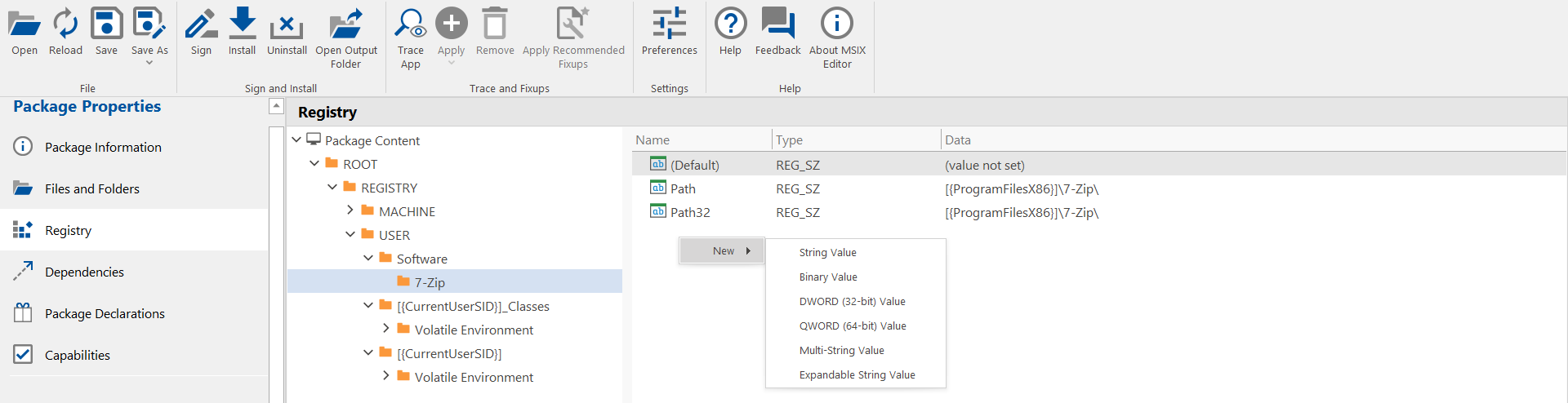 2. In the Registry pane, select desired registry key. To add registry value and data to the selected registry key, right click on the right pane, click on New drop down, and then select one of the value types from the list.