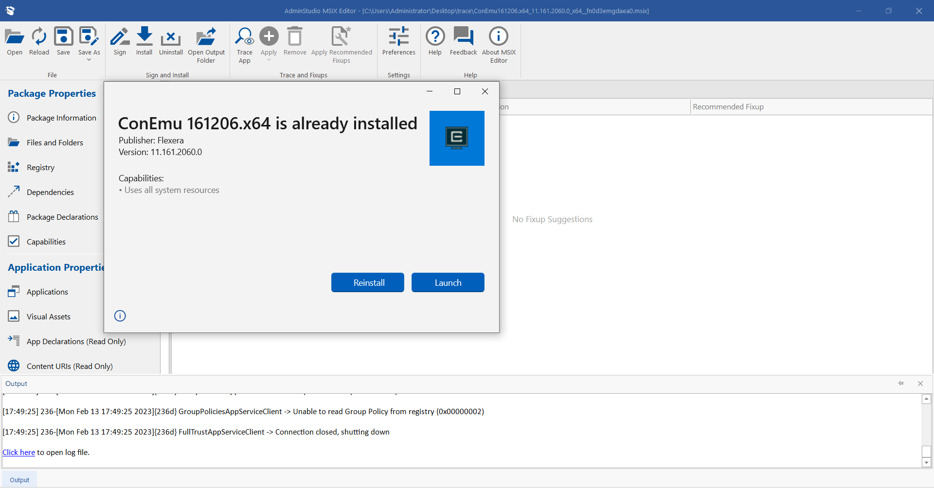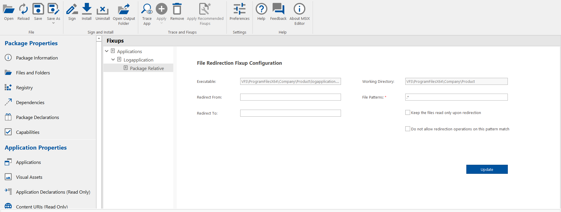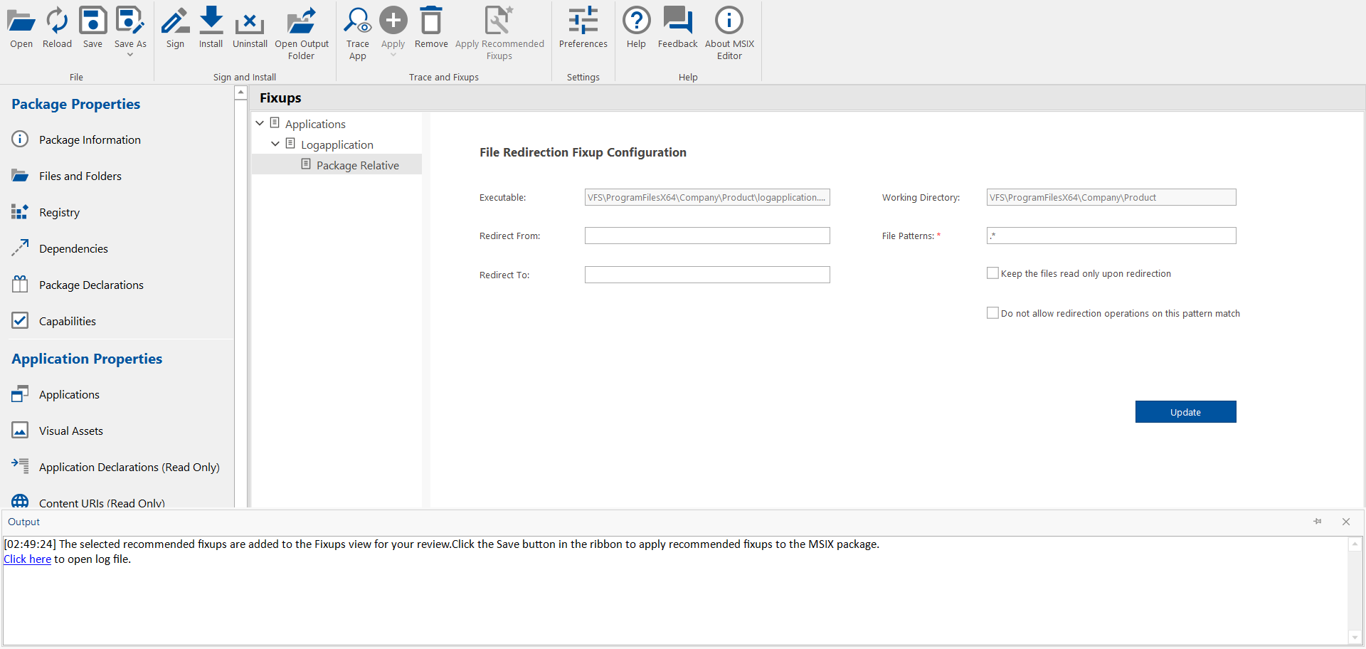 MSIX Editor can automatically recommend fixups for the run time issues encountered while testing an application during trace. The automatic recommendation of fixups currently supports only the File Redirection Fixup and Registry Fix.